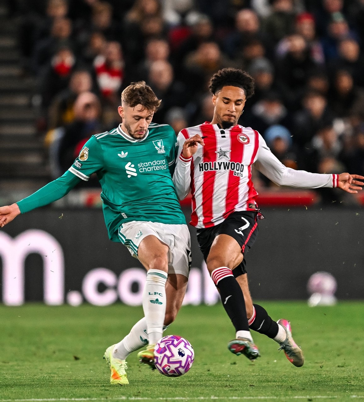 В составе «Ливерпуля» Арне Слот назначил Салаха опорным полузащитником Экитике, а Вирц и Гакпо связали два фланга – ось концентрации для создания прорывов в последней трети поля. Однако гости испытывали трудности с многослойной обороной «Брентфорда». Гакпо и Вирц проникали в зону поражения с нехваткой пространства, а редким ярким моментом стала атака Керкеза в конце первого тайма.