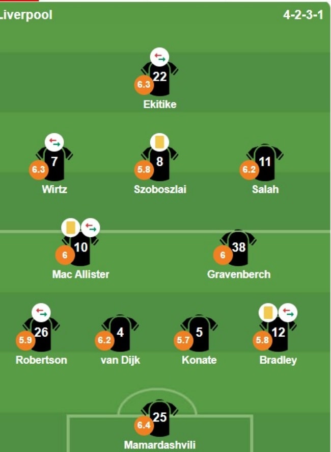 В атаке Виртц владел мячом и был техничен, но ему не хватало взаимодействия, чтобы реализовать явные моменты. Салах действовал энергично, несмотря на отсутствие поддержки, и однажды создал угрозу углового, которая привела к отмене гола. Экитике играл флангово и агрессивно, но редко получал мяч в нужный момент и покинул поле в начале второго тайма.
