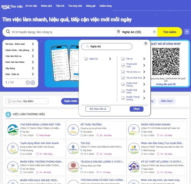 Để tìm được việc ở Nghệ An đúng chuyên ngành phù hợp, nhiều ứng viên đã ưu tiên sử dụng các trang web việc làm chuyên nghiệp có tiếng. Không ít website đã xây dựng thành công hệ thống việc làm theo tỉnh thành, giúp người lao động tại Nghệ An thuận tiện tiếp cận việc làm đúng nhu cầu, trong đó điển hình có Timviec365.vn. Các nền tảng này đã tập hợp đa dạng ngành nghề như dịch vụ, sản xuất, kỹ thuật, kinh doanh, văn phòng, ... Đồng thời còn cho phép người tìm việc lọc bản tin theo từng khu vực tỉnh thành, phường xã cụ thể.